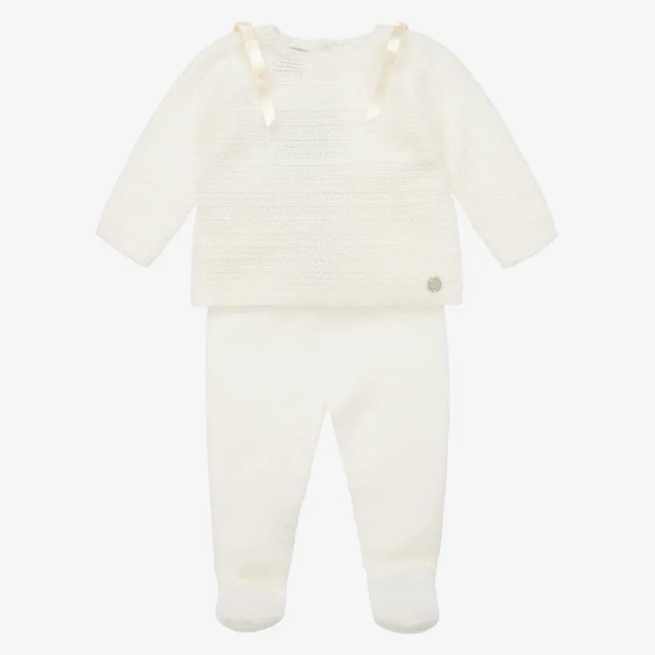 Ivory two-piece babygrow for boys and girls by Paz Rodríguez, knitted in soft, luxurious Merino wool. The top has a charming stitched pattern, mother-of-pearl charm, and satin bows decorating the shoulders. It secures neatly with buttons on the back. The closed-feet trousers have a stretchy waist for simple nappy changing.