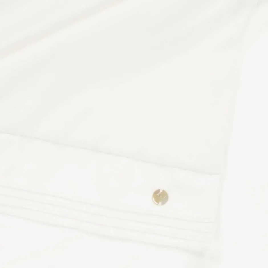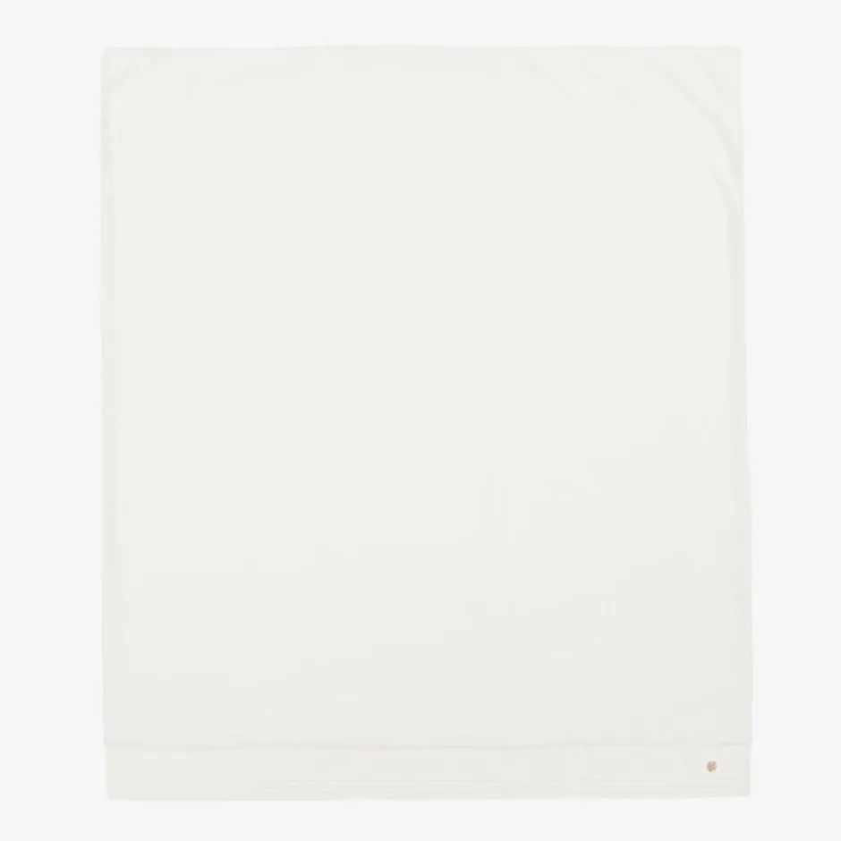 Ivory cotton blanket for baby boys and girls from Spanish brand, Paz Rodriguez. This cosy, double-layer blanket is made in super soft velour with comfortable ivory jersey on the reverse. For a lovely finishing touch, one end is edged with ivory twill and trimmed with a mother-of-pearl logo charm.
