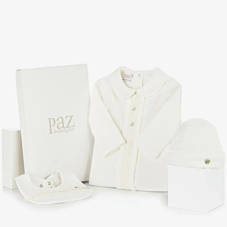 Ivory babysuit set for boys and girls by Paz Rodríguez, made in soft cotton velour. For a classic look, the babygrow has a Peter Pan collar and a pin-tucked panel on the front, detailed with delicate lace and decorative buttons. It fastens on the back and between the legs with poppers. Lined in soft jersey, the cosy hat has a cute turn-up brim. A matching bib, lined with lightweight voile completes the sweet set. For designer appeal, each piece features the Spanish brand's mother-of-pearl logo charm.