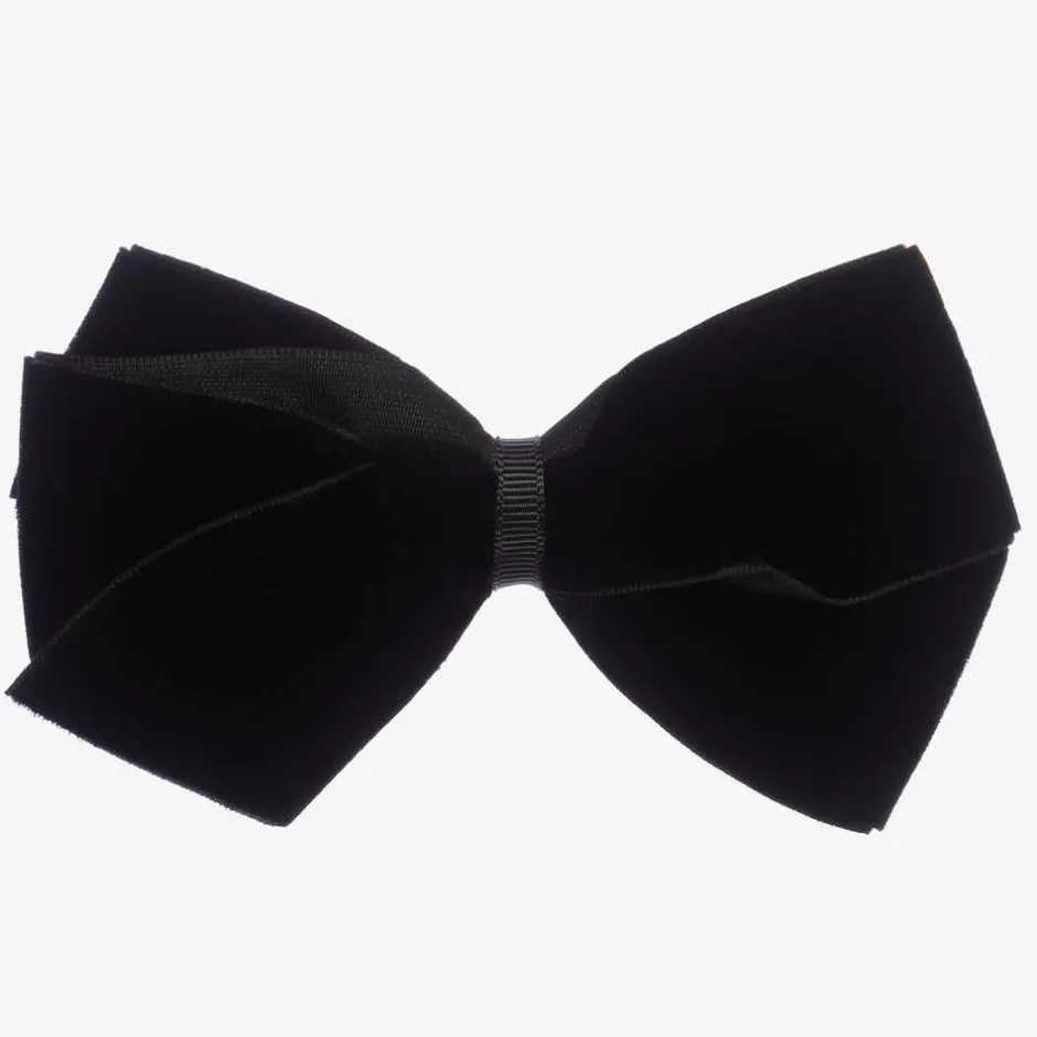 Girls classic black velvet bow hair clip by Peach Ribbons, set on a metal clip.
