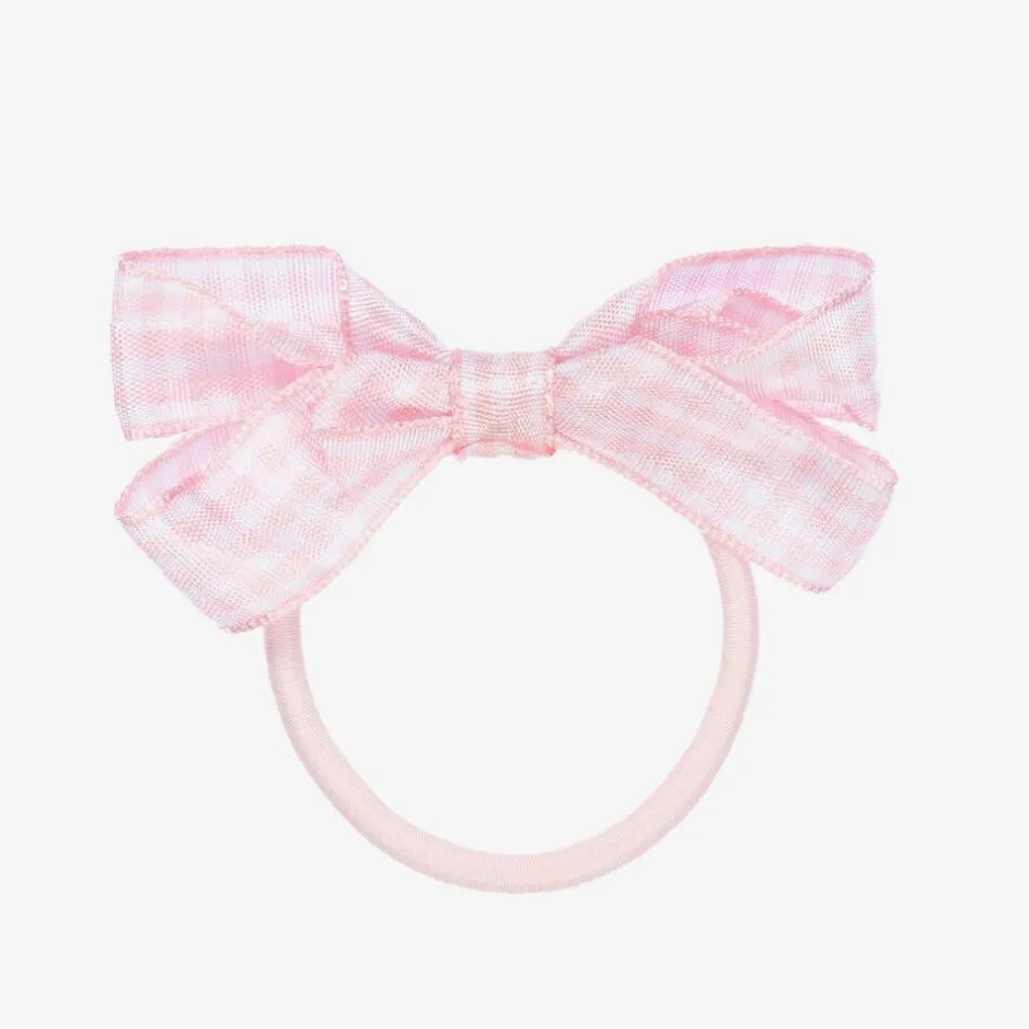 Girls pretty hair elastic by Peach Ribbons, with a traditional pale pink and white gingham check ribbon bow.