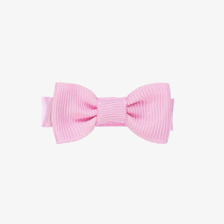 Girls pink handmade bow hair clip by Peach Ribbons. A finishing touch to an outfit, this sweet accessory is made in grosgrain ribbon and set on a metal clip.