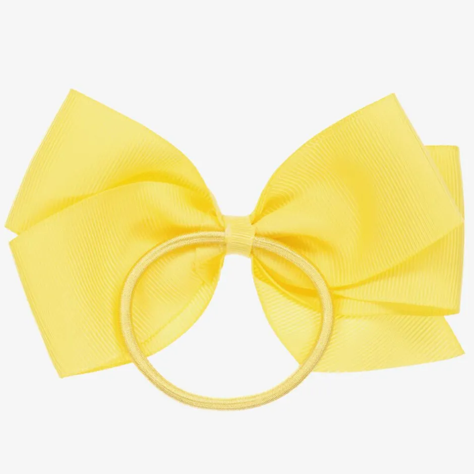 Bright yellow hair elastic for girls from Peach Ribbons. Lovely to complete an outfit, this pretty accessory has a large handmade grosgrain ribbon bow detail.