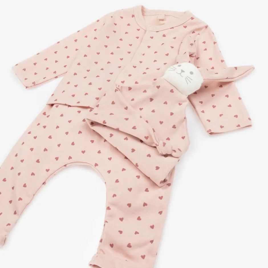 Pink trouser set for baby girls by French brand Petit Bateau, made in soft organic cotton jersey. Patterned with romantic love hearts, the round neck top has long sleeves and easy popper fastenings on the front. Matching trousers have a comfortable elasticated waist and turned-up cuffs. An adorable rabbit dou dou, with floppy ears and knotted corners, completes this lovely three-piece set.