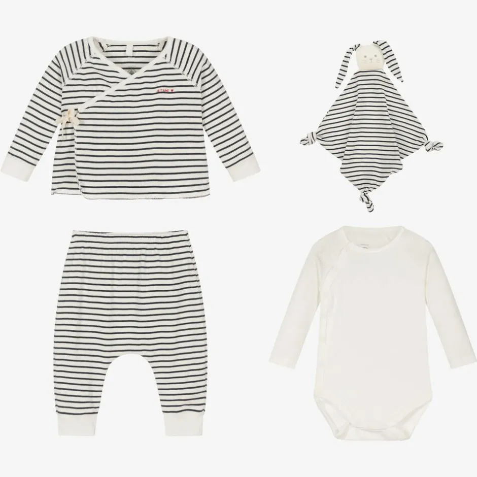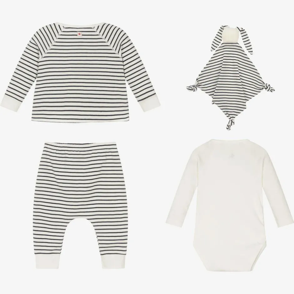 Four-piece trouser set for baby boys and girls by classic French brand Petit Bateau, with navy blue and ivory Breton stripes. Beautifully comfortable, it is made in soft organic cotton jersey, with ribbed trims. The top has a cross-over front with a tie and popper fastening, and 'I Love You ♥' printed in red on one side. The white bodyvest has easy-to-use popper fastenings on the side and between the legs, whilst the pull-up trousers have a stretchy, elasticated waist. An adorable, matching rabbit dou dou with knotted corners completes the set.