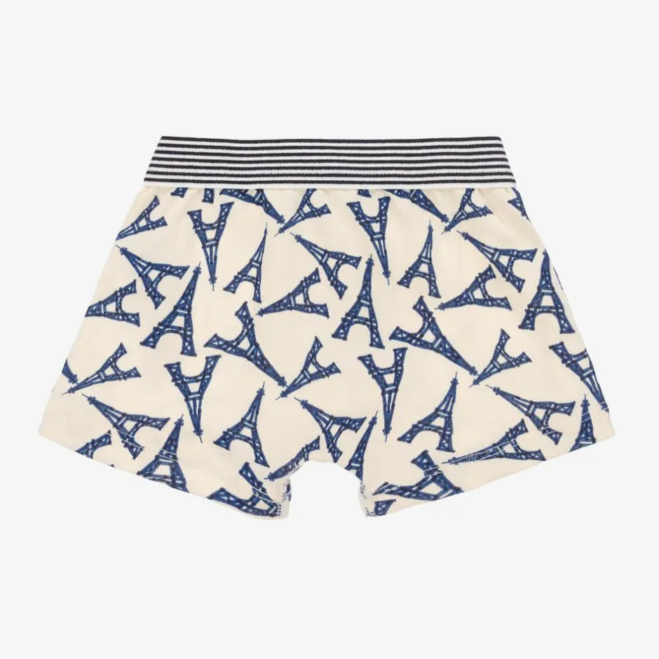 A three-pack of ivory and blue boxers for boys by Petit Bateau, made in soft organic cotton jersey. With striped, elasticated waistbands, one pair are plain, the second are striped, and the third feature Eiffel Tower prints to celebrate the designer's heritage.