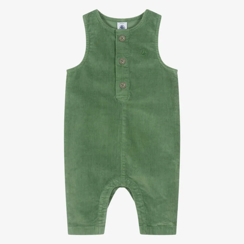 Cute green corduroy dungarees for little boys by Petit Bateau, made in soft organic cotton. They have neutral button fastenings on the front for style and the signature sailboat logo embroidered on the chest for a touch of branding. Useful poppers between the legs help with dressing and changing.