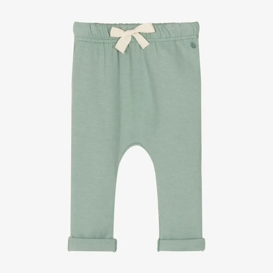 Green organic cotton trousers for little boys and girls by Petit Bateau, made in soft and comfortable jersey. They have a gently elasticated waistband with a faux tie detail and cute turn-up cuffs. A small tonal logo print on the hip adds a subtle branded finish.