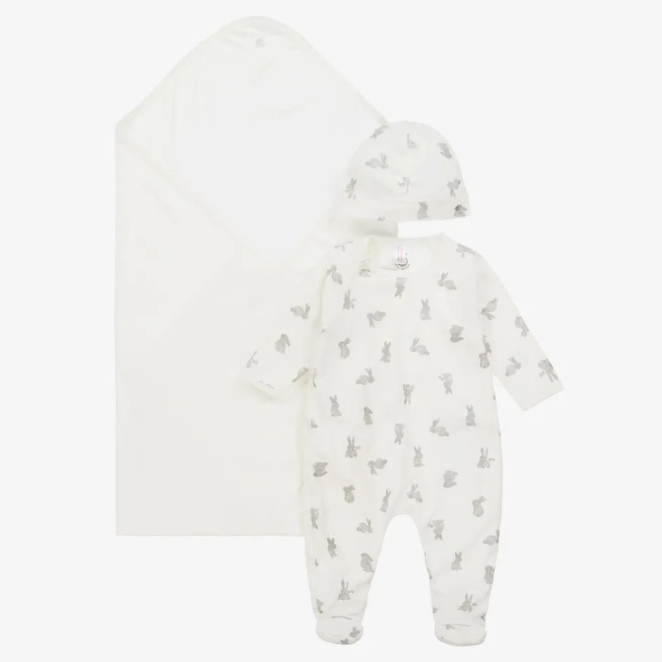 Sweet ivory babygrow hat and blanket set for boys and girls by Petit Bateau, made in soft organic cotton jersey. Gentle against delicate skin, the babygrow is patterned with cute grey bunny rabbits and fastens with poppers on the side and down one leg. There is a matching hat and a plain ivory blanket with a grey logo on one corner, ideal for use in the nursery or in a car seat or stroller.