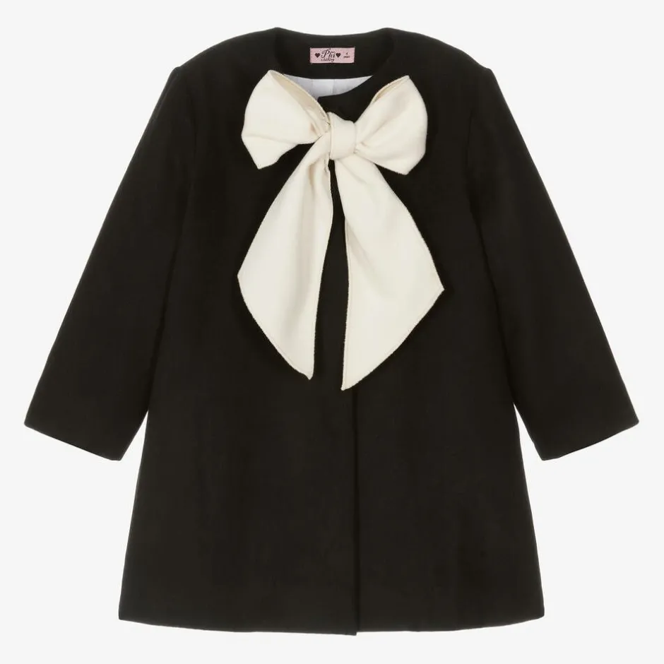 A lovely black coat for girls by Phi Clothing, with a beautifully soft felted feel. This smart design has concealed popper fastenings and a chic, decorative ivory bow on the neckline. It has concealed side seam pockets to keep belongings accessible and a lightweight voile lining for added comfort.