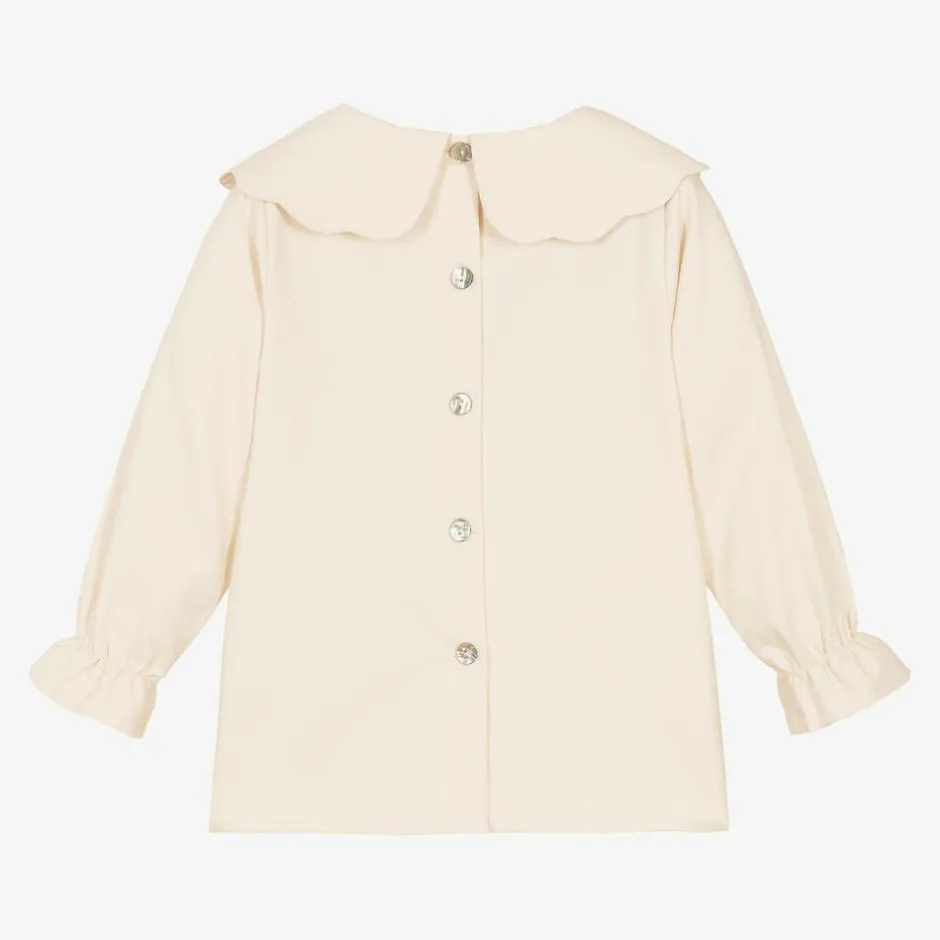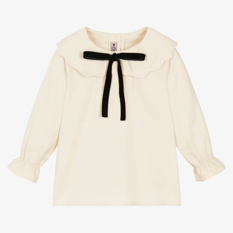 A lovely blush ivory blouse for girls by Phi Clothing, made in a soft cotton twill blend with mother-of-pearl buttons on the back. It has a pretty scalloped collar with a black velvet bow in the centre. The long sleeves have elasticated frill cuffs for a comfortable fit on the wrist.