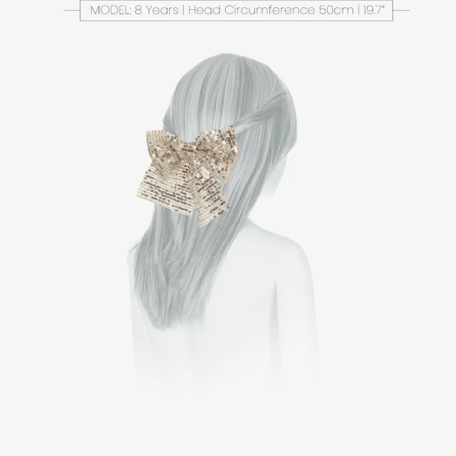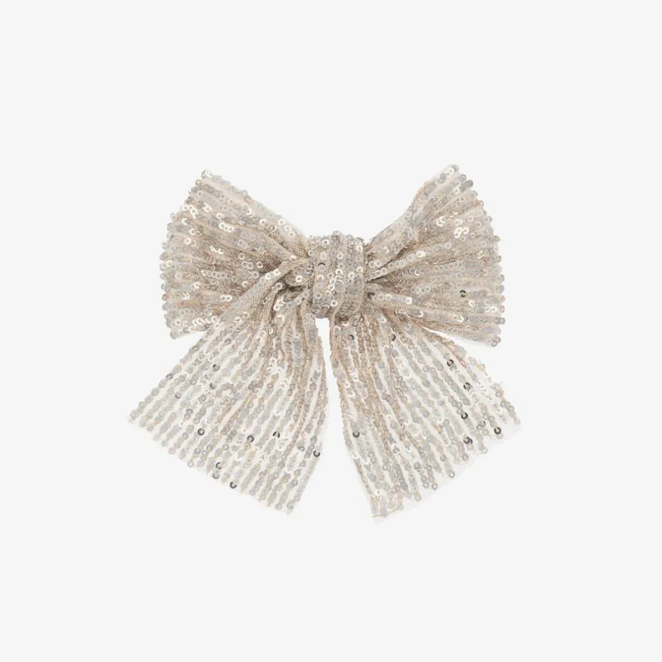 Pale gold-beige bow hair clip for girls by Phi Clothing, beautifully decorated with dazzling silver sequins. Ideal for sparkling up a party outfit, this lovely accessory is lightweight and easily slides into the hair with a metal crocodile clip.