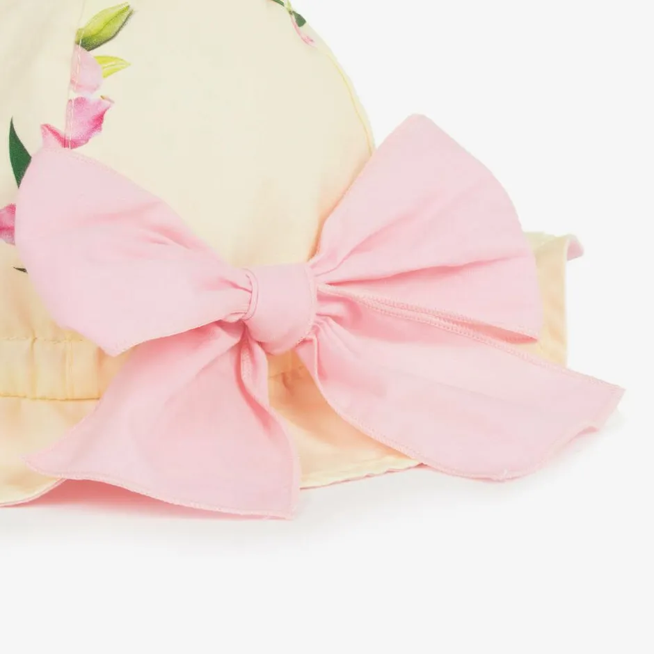 Lovely yellow sun hat for little girls by Phi Clothing, made in soft, lightweight cotton. Patterned with a pretty pink and green floral print, it has a pink lining and is gently elasticated around the brim for a comfortable fit. There is a large pink bow fixed to the back for a sweet finish.
