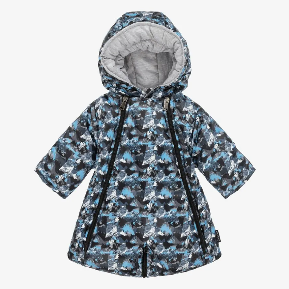 A blue and white snowsuit for baby boys by Pilguni, patterned with an abstract alpine mountain print. Ideal for colder temperatures, this practical snowsuit is warmly padded with Isosoft insulation and lined with comfortable cotton jersey. It has built-in mittens and booties that easily fold over and it also converts into a cosy snow bag by adjusting the zips at the bottom. Soft and silky, it has stretchy ribbed cuffs and double zip fastenings on the front and between the legs for easier dressing. The protective hood is gently elasticated to help keep it in place.