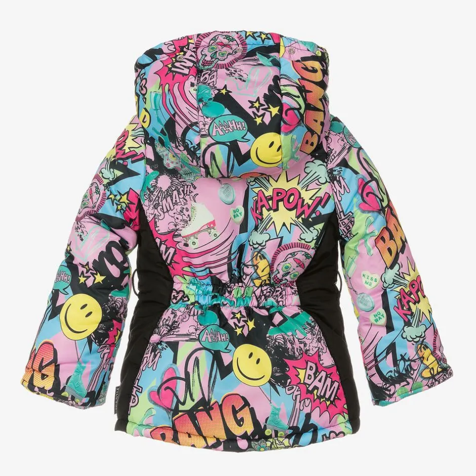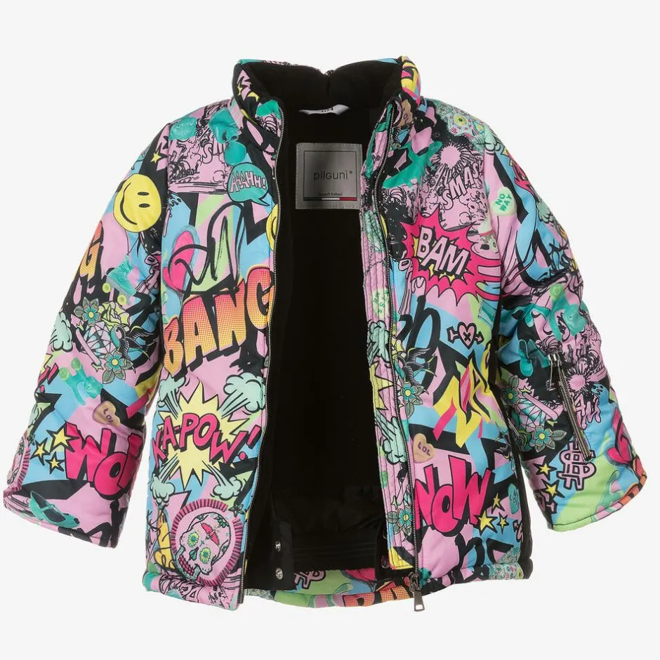Patterned in a bright and colourful graffiti print, with black side panels, this pink water-resistant ski jacket for girls is by Pilguni. Providing optimum protection in the coldest weather, it is warmly padded with Isosoft insulation and has a cosy polar fleece lining. To keep out both snow and icy winds, it has stretchy internal sleeve cuffs, an elasticated snow skirt, and secure front zip fastening. It features a detachable hood with a removable bright pink faux fur trim and internal straps to carry on the shoulders when not worn. It has an elasticated panel at the back for a comfortable and more feminine silhouette, cosy fleece-lined zipped pockets and a ski pass pocket on the sleeve.