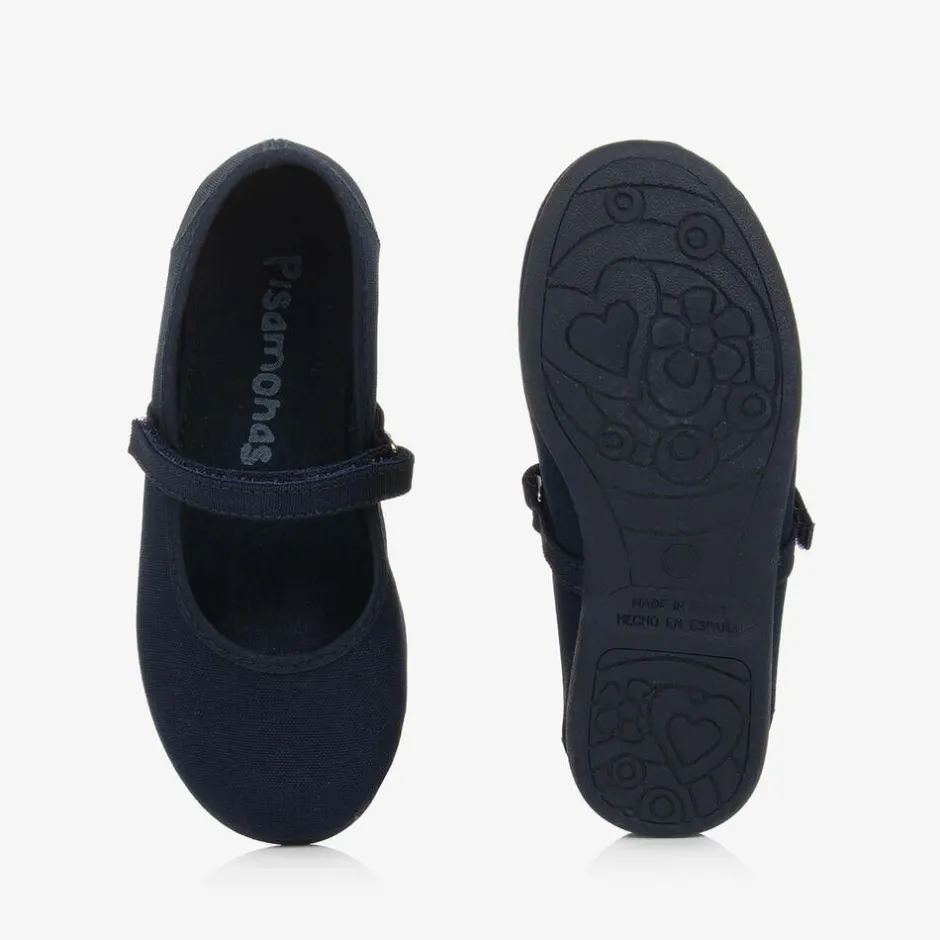 Navy blue bar shoes for girls by Spanish brand Pisamonas. Made in soft canvas, they fasten simply with a velcro strap across the foot. These pretty, casual shoes have a non-slip rubber sole in the same colour as the shoe making them even easier to combine with all outfits.