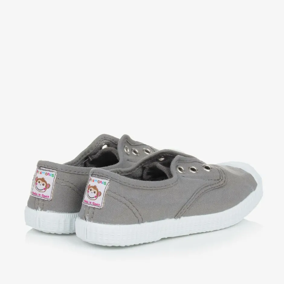 Grey canvas trainers for boys and girls from Pisamonas, with reinforced toe-caps for durability. These slip-on shoes have elasticated inner panels for quick and easy dressing. The rubber soles are treaded for safety, the front is designed with eyelets for that classic look, and the Spanish label's cute monkey logo patch is stitched on the back.