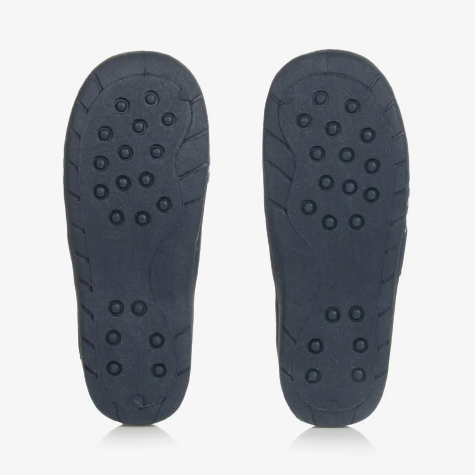 Designed by Playshoes, these blue and white striped slippers are for boys and girls. In the style of plimsolls, they have a flexible non-slip rubber outsole for good grip and an elasticated strap across the toes. Made from soft fabric with comfortable textile lining, they are easy to slip-on and have a red anchor printed on the front with matching red trims.