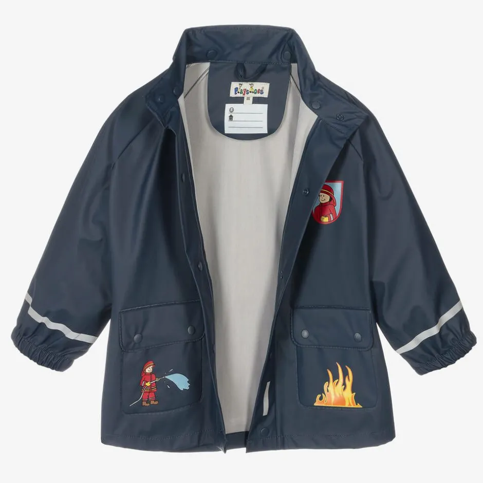 Little boys navy blue hooded raincoat by Playshoes. Smooth and lightweight, this raincoat has taped seams making it both waterproof and wind resistant. It has a fully detachable mesh-lined hood, light reflective safety stripes, and two pockets on the front which fasten with poppers. This coat features fun red fire brigade prints, with a large fire engine on the back.