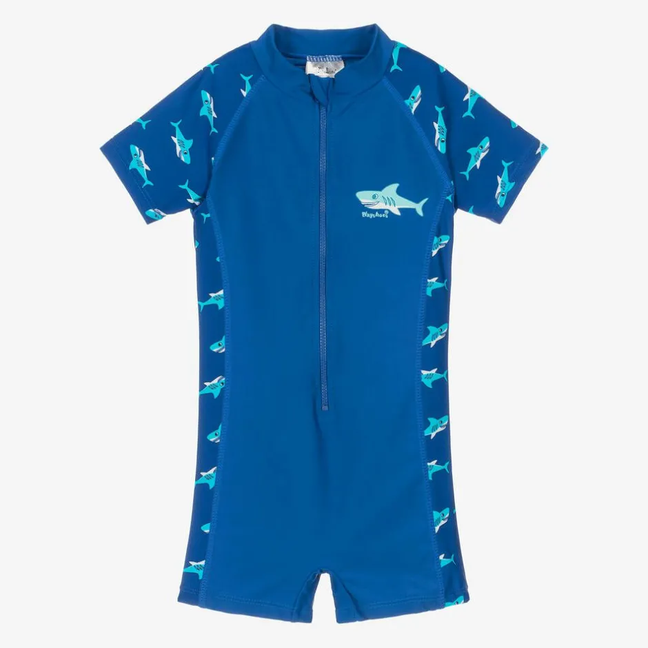 Little boys bright blue all-in-one sun suit by Playshoes, with cool shark print panels. With UPF 50+, this silky and stretchy one-piece fastens with a zip on the front for easy dressing, and is great to wear by the pool or on the beach.