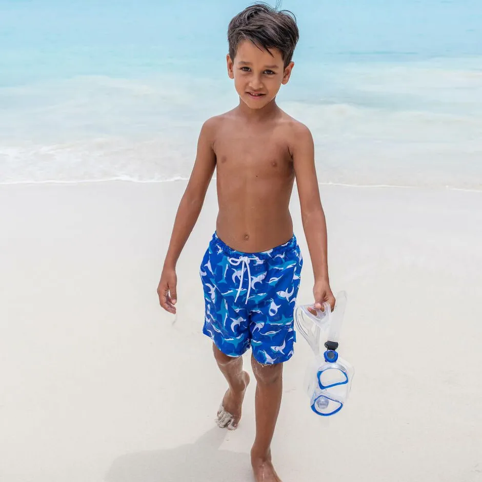 Fun bright blue and white shark print swim shorts for boys from German brand Playshoes, made from smooth and lightweight fabric with UPF40+. They have a soft mesh lining, an elasticated waist with adjustable drawstring and useful eyelets on the back, allowing comfortable wear. There are pockets on the side seams and a logo tab.