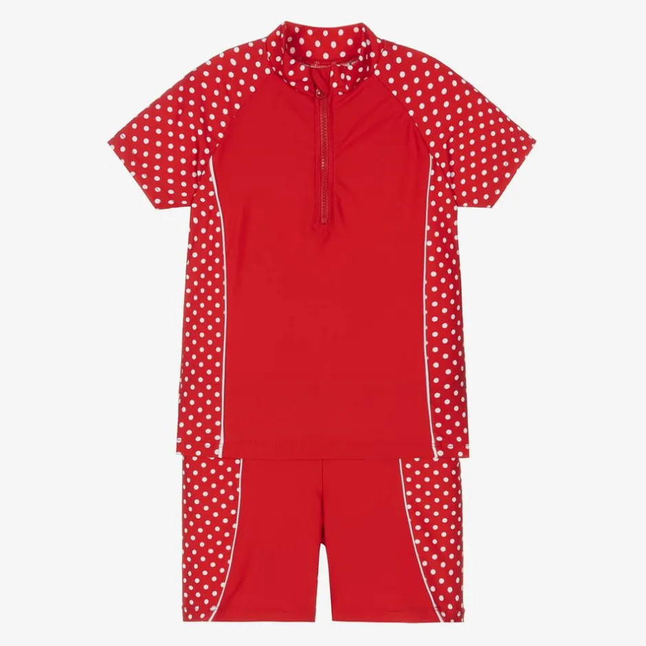 Little girls red UPF50+ swim set by Playshoes, with pretty white polka dot prints. Comfortable to wear by the pool or beach, the short-sleeved top fastens with a zip on the front and the jersey-lined shorts have an elasticated, drawstring waist.