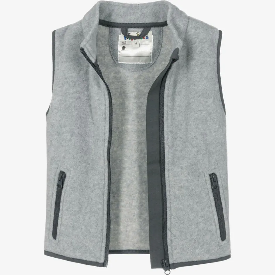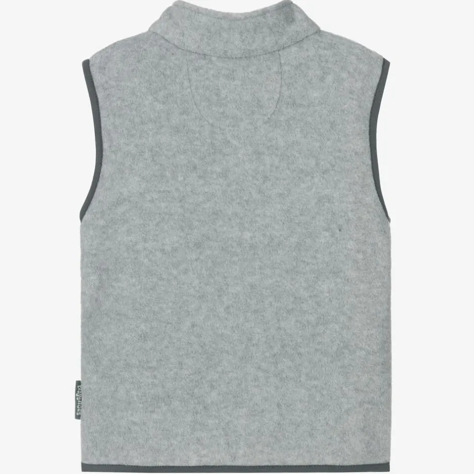 Grey gilet for boys and girls from Playshoes, made from soft fleece with matching trims. It has a high neck, a chin guard on the top of the zipper and two useful zipped pockets. Practical and versatile for everyday, it also makes a cosy layering piece when the season changes.