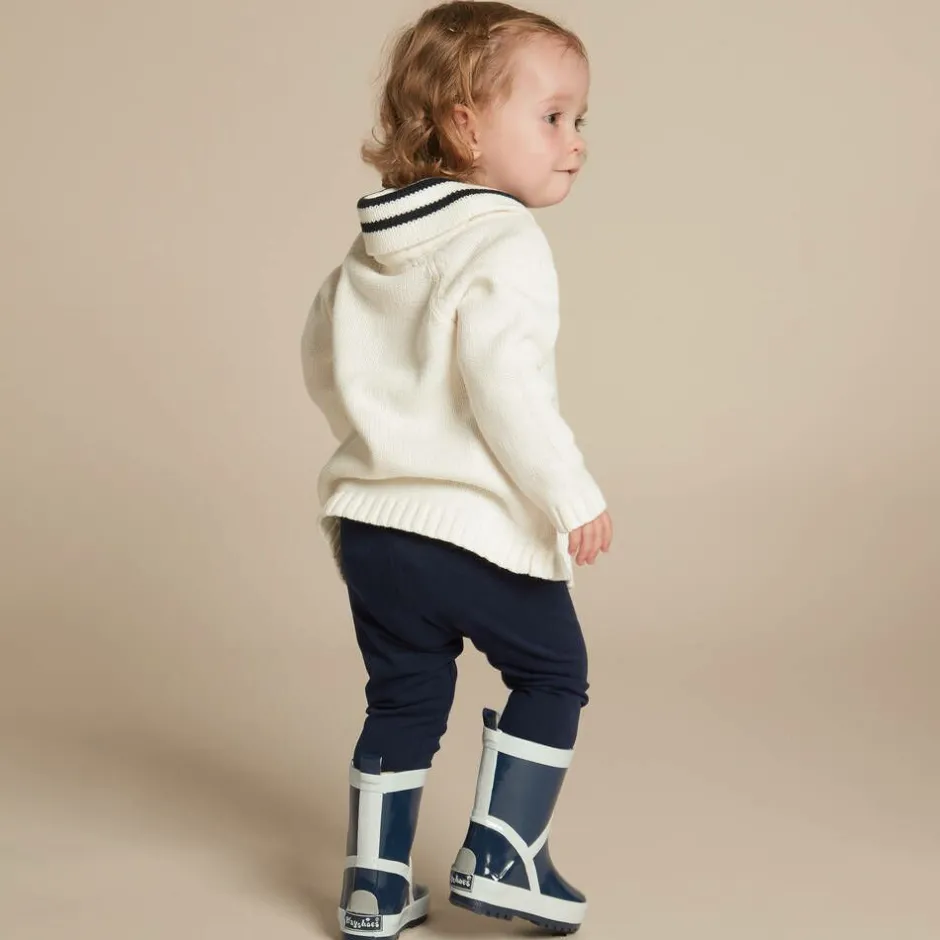 Navy blue rain boots for girls and boys by Playshoes, made from flexible rubber. Lined in soft textile, they have a padded inner sole for comfort, and a silver reflective patch on the back for safety during evening walks.