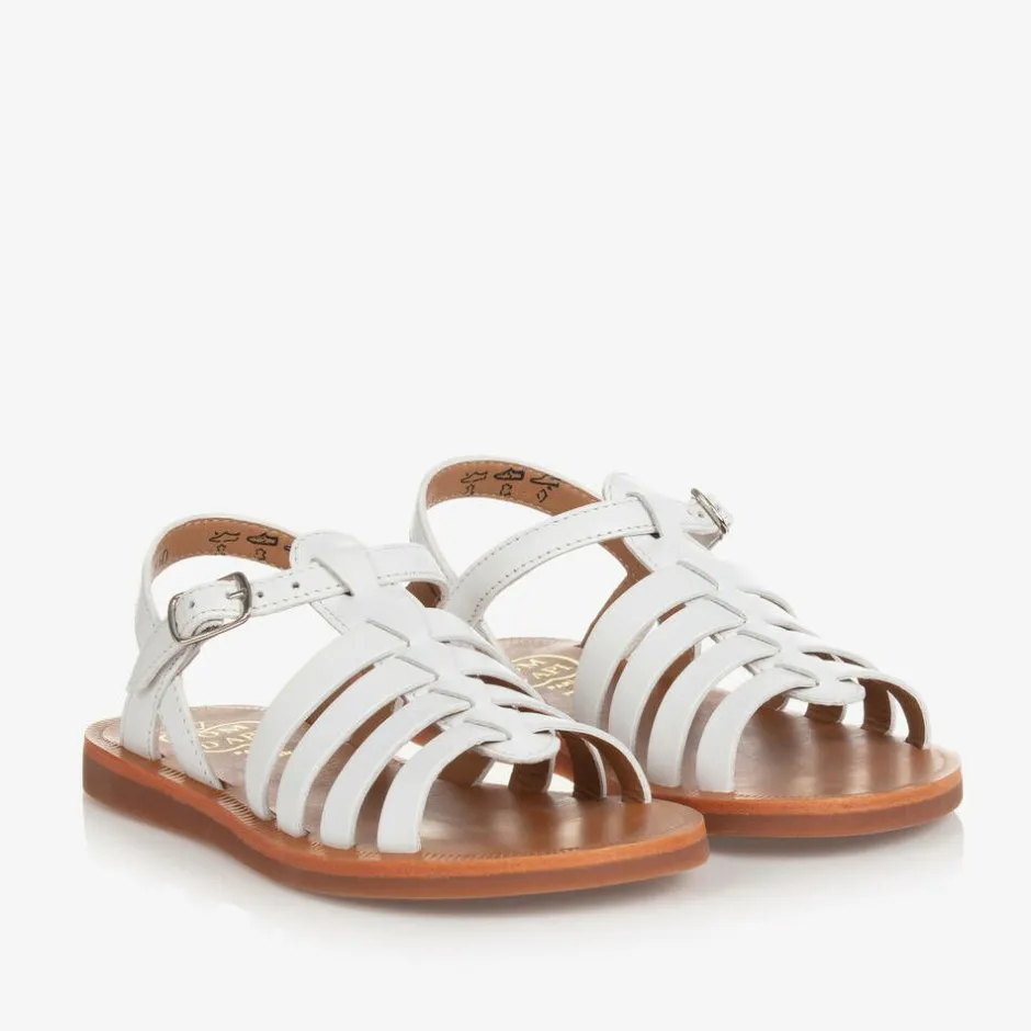Lovely white leather sandals for girls by French footwear brand Pom d'Api. Stylish and comfortable for warm weather, this strappy design is lined in soft and supple leather with a tan brown leather insole. The rubber outsole is flexible and textured with cute sea shells for added grip. They fasten with a silver buckle at the ankle for an adjustable fit.
