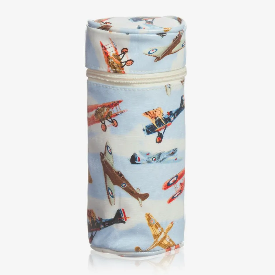 Exclusive to Childrensalon, a blue and white baby changing bag from Powell Craft, made in smooth coated canvas with a vintage aeroplane print. Lined with silky fabric, it has multiple inner pockets for tidy storage. It has magnetic popper fastenings and an adjustable shoulder strap with a padded section to hold comfortably over the shoulder. The bag comes with a lightly padded changing mat that folds up easily for storage and a matching zip-up bottle holder.