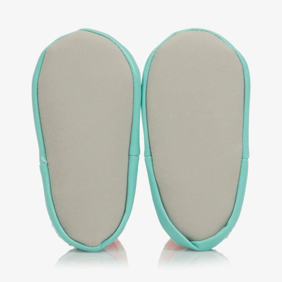 Moccasin slipper socks for younger girls from Powell Craft, in pink and turquoise blue. Great for keeping feet cosy, the base is made from non-slip faux leather and the cotton-rich socks have white polka dots and a grey bear motif.