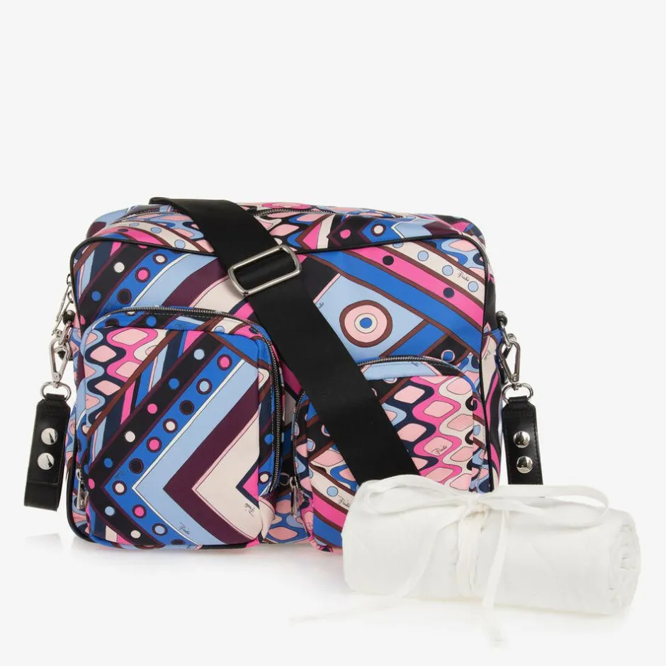 Striking blue and pink changing bag by luxury Italian designer, PUCCI. Not only stylish but also super practical, this baby bag is patterned in the brand's blue and pink Vivara print. The spacious main compartment has an internal zip fastening pocket and small pouches for organisation. There are smaller zip-up pockets on the front, one of which contains a useful quilted changing mat for nappy changes on-the-go. For versatile carry options, it comes with useful stroller straps to attach to a pram or buggy and a longer-length shoulder strap. Small designer touches, like the iconic Pesci emblem zip-pull and embossed logo details, complete the accessory with a luxe, designer feel.