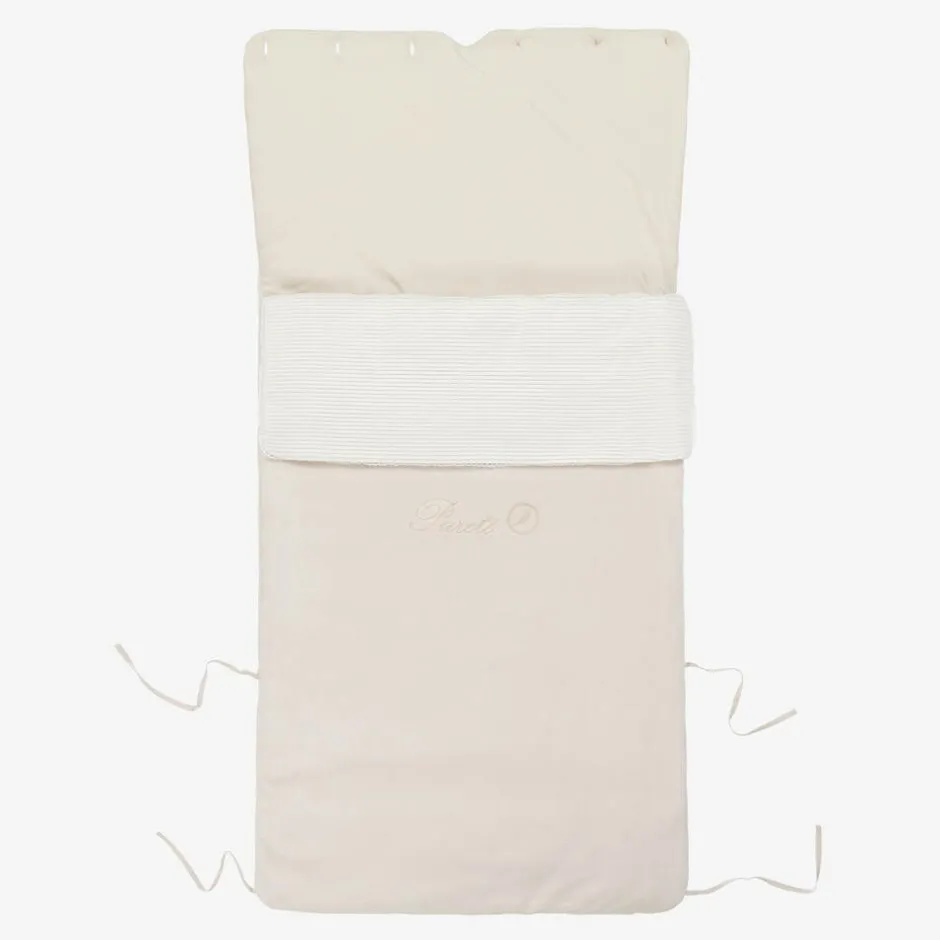 Exclusive to Childrensalon, a lovely beige nest for baby boys and girls by Pureté Du… Bébé, with ties on each side to adjust the length as your little one grows. Lightly padded, this cosy nest is made in super soft velour with a cotton jersey lining. It has a finely pleated woven panel on the front, with a delicate scalloped lace trim and tonal logo embroidery for designer appeal. Fastening with a zip along one side and across the base, it has buttons on the hood which can be unfastened to create a flat, comfortable surface for baby to lay on.