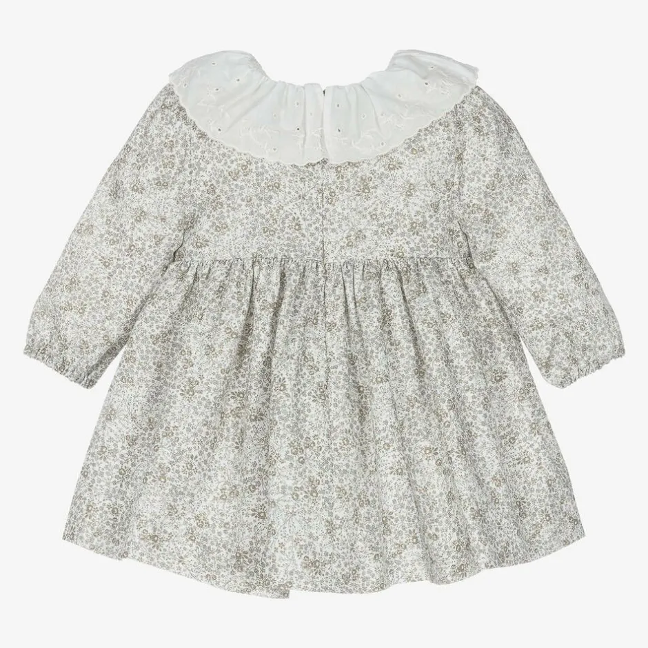 Lovely white cotton dress for younger girls by Pureté Du… Bébé, with a delicate green and blue floral design. This sweet dress has a pretty, white, ruffled, embroidered collar and a shirred bodice trimmed with a little mother-of-pearl logo charm. It has gently elasticated cuffs, a comfortable voile lining and fastens neatly on the back with a concealed zip.