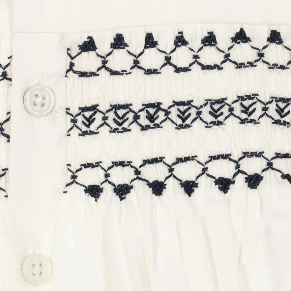 Ivory and navy blue cotton shorts set for baby boys by Rachel Riley. The smart, lightweight ivory shirt has traditional hand-smocking with embroidery detailing across the chest. It has a Peter Pan collar with navy blue trims and fastens down the front with buttons. The lightweight, navy blue shorts button to the shirt, keeping it neatly tucked in.