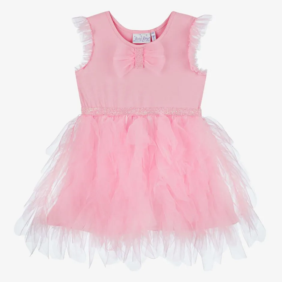 A bright pink dress for girls by British designer Rachel Riley, lovely for parties and celebrations. Trimmed with layers of fabulous tulle, this fun dress has a bow detail on the bodice, a glittering, elasticated waistband, and a ruffled skirt that is full of flounce. Both made in cotton for comfort and simple dressing, the bodice is stretchy jersey and the skirt lining is lightweight voile.