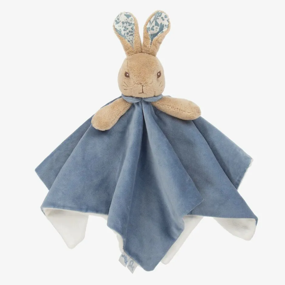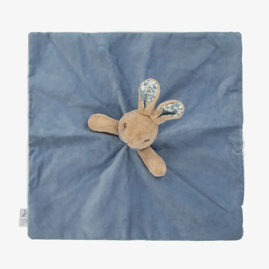A lovely blue Peter Rabbit doudou for baby boys and girls, by Rainbow Designs. From the signature collection, this traditional story character is made in beautifully soft beige plush with a lovely blue woodland print on the ears. To help soothe and comfort, this adorable companion is designed so little hands can easily hold onto his floppy ears and wide blanket body.