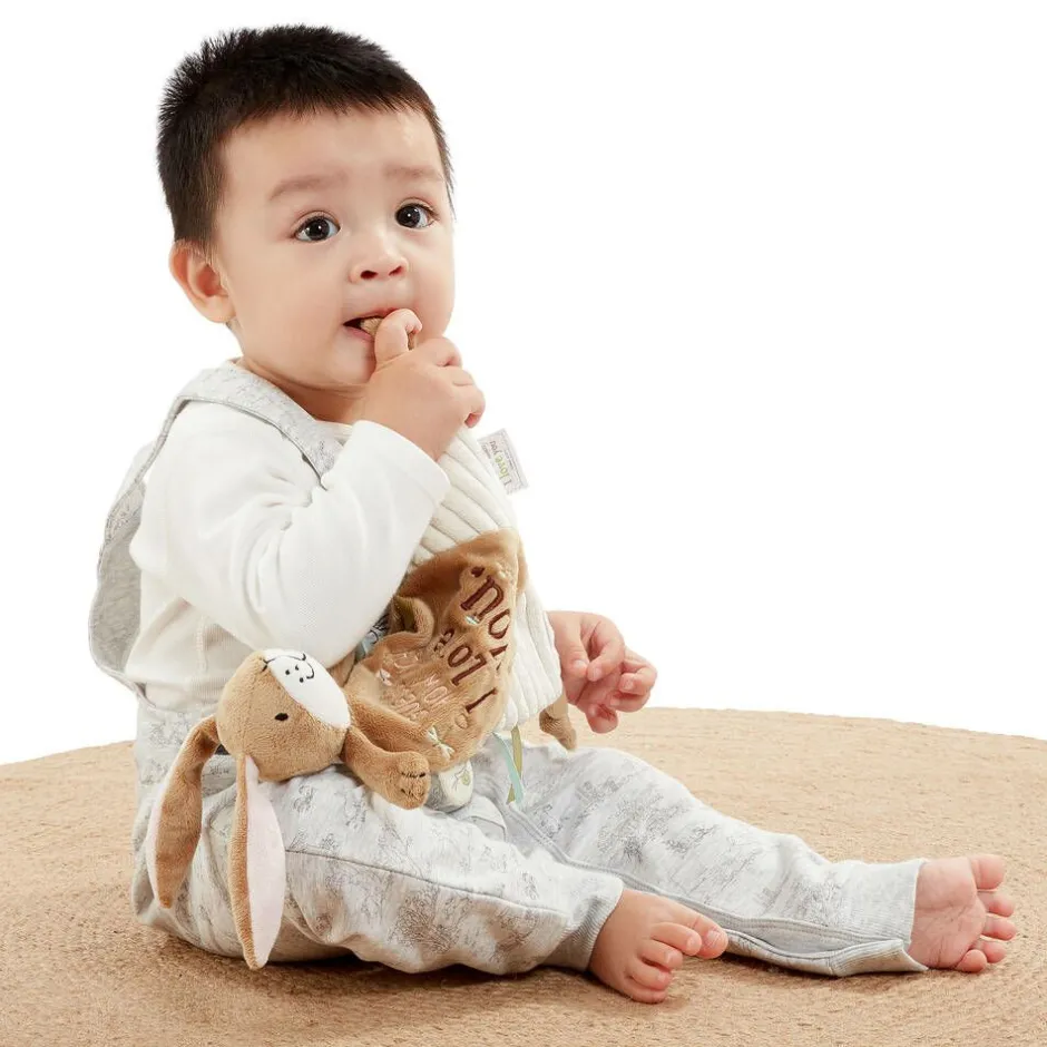 Inspired by the 'Guess How Much I Love You' stories, this beige hare doudou for baby boys and girls is by Rainbow Designs. Made from soft padded plush it has a cute face and embroidered detailing on the front. Super comforting and cuddly, it has silky ribbon trims and smooth twill tabs allowing baby to explore different textures for extra sensory stimulation.