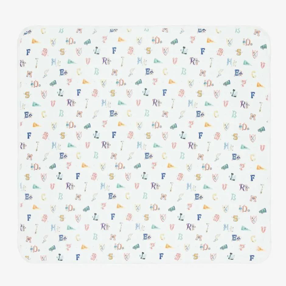 Beautifully soft, white cotton blanket for baby boys by Ralph Lauren, made in a double layer of comfortable cotton jersey. Designed in collaboration with artist Riley Sheehey, it has whimsical prints inspired by classic children's book illustrations. Archival Ralph Lauren motifs can be seen throughout the pattern for a branded touch and the signature pony logo is embroidered in one corner.