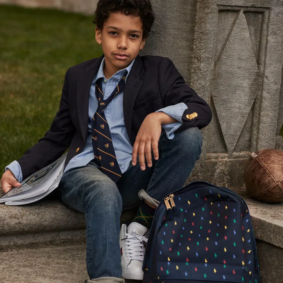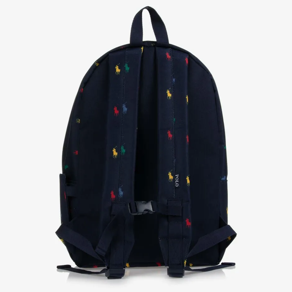 Navy blue backpack for boys and girls by Ralph Lauren, patterned with the brand's red signature pony logo. Made in sturdy canvas, it has a spacious main compartment and an exterior pocket, both are zip-fastening with branded bronze-tone metal pulls. Great for school, it also features a laptop sleeve, a side slip pocket, a carry handle and a padded backing. The adjustable shoulder straps come with useful chest straps for extra support and comfort when carrying the bag around.