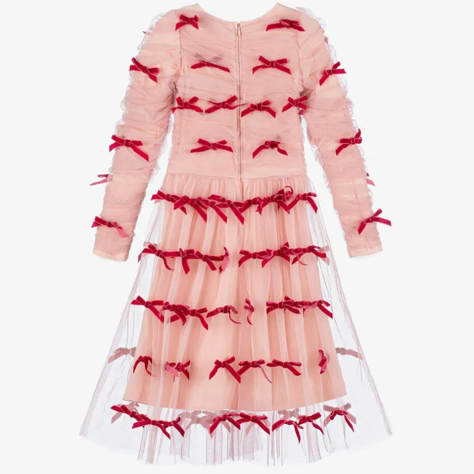 Gorgeous pink dress for girls by RaspberryPlum, made in gathered tulle for that stylish ruched effect. A true one-of-a-kind, it is covered in fabulous red velvet bows and falls effortlessly below the knee. Careful not to distract from the stand-out style, this midi dress fastens with a concealed zip on the back and has a super soft cotton jersey lining.