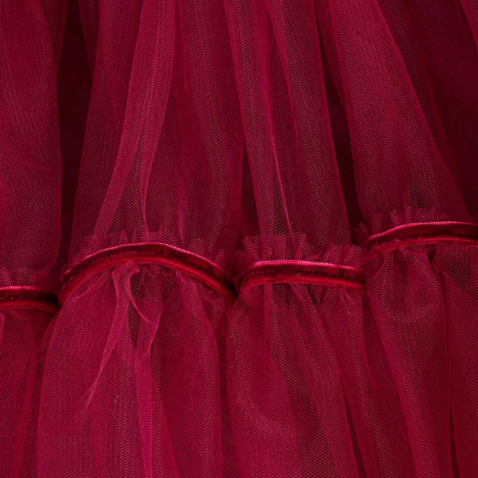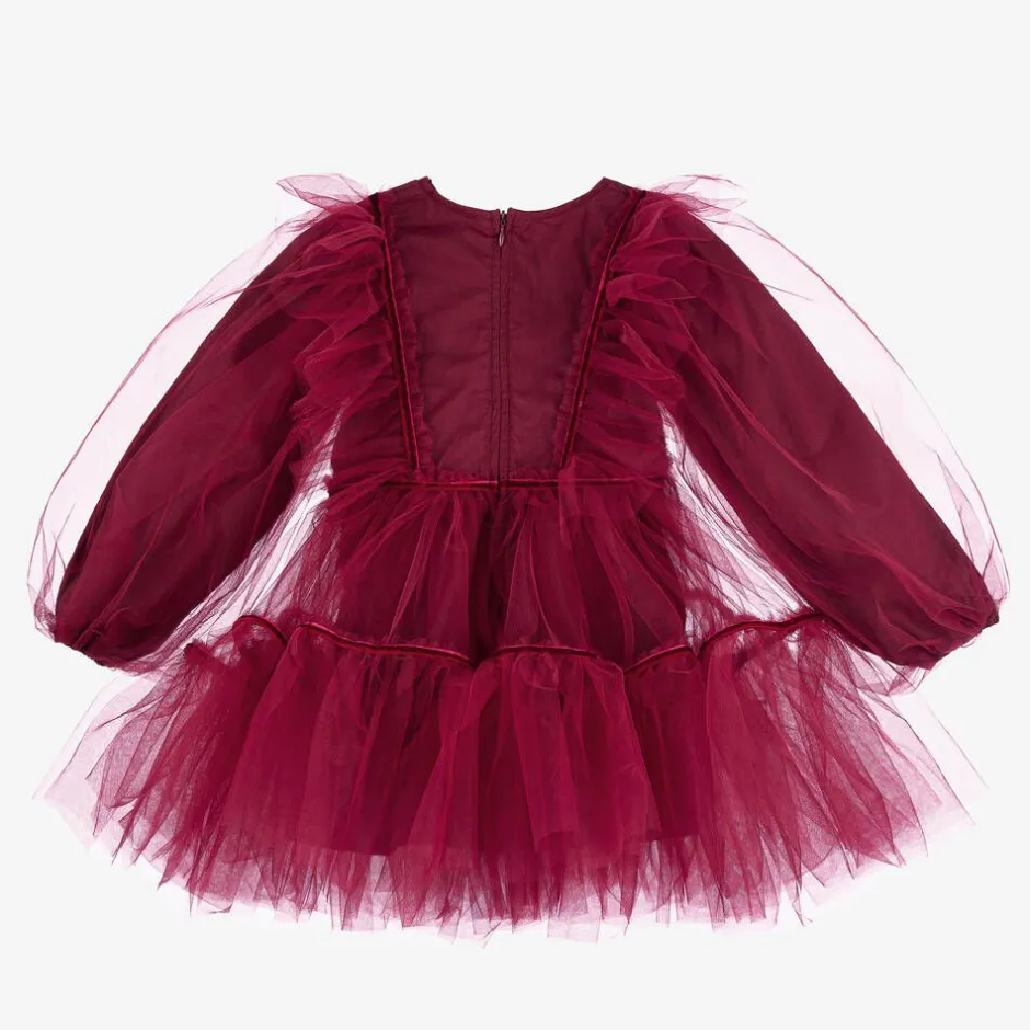 Deep red dress for girls by London-based designer, RaspberryPlum. Made in fine tulle with exaggerate volume, this striking trapeze dress has long, puffed sleeves, a tiered skirt, and lustrous velvet trims. It has a soft cotton lining, ideal for comfort during those special, stand-out occasions.
