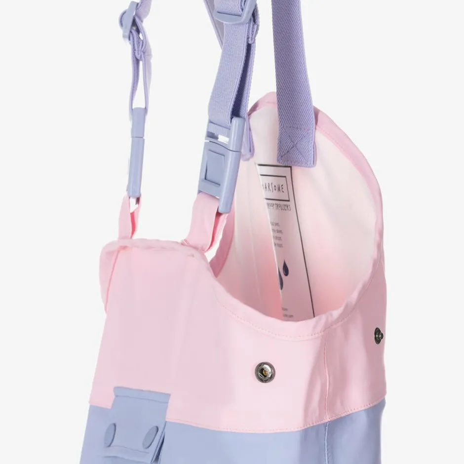 Purple and pink rain trousers for girls by outerwear brand Roarsome, made in smooth waterproof fabric. Great for wet weather days, they have taped seams, aqua seal zips, and buckle-clip fastening elasticated shoulder straps that can be adjusted for comfort. The back of the waist is gently elasticated and there are poppers to secure on each side for the best fit. The elasticated ankle cuffs have adjustable stirrups that attach with poppers. A rubberised unicorn character on the front pocket adds a fun finishing touch.