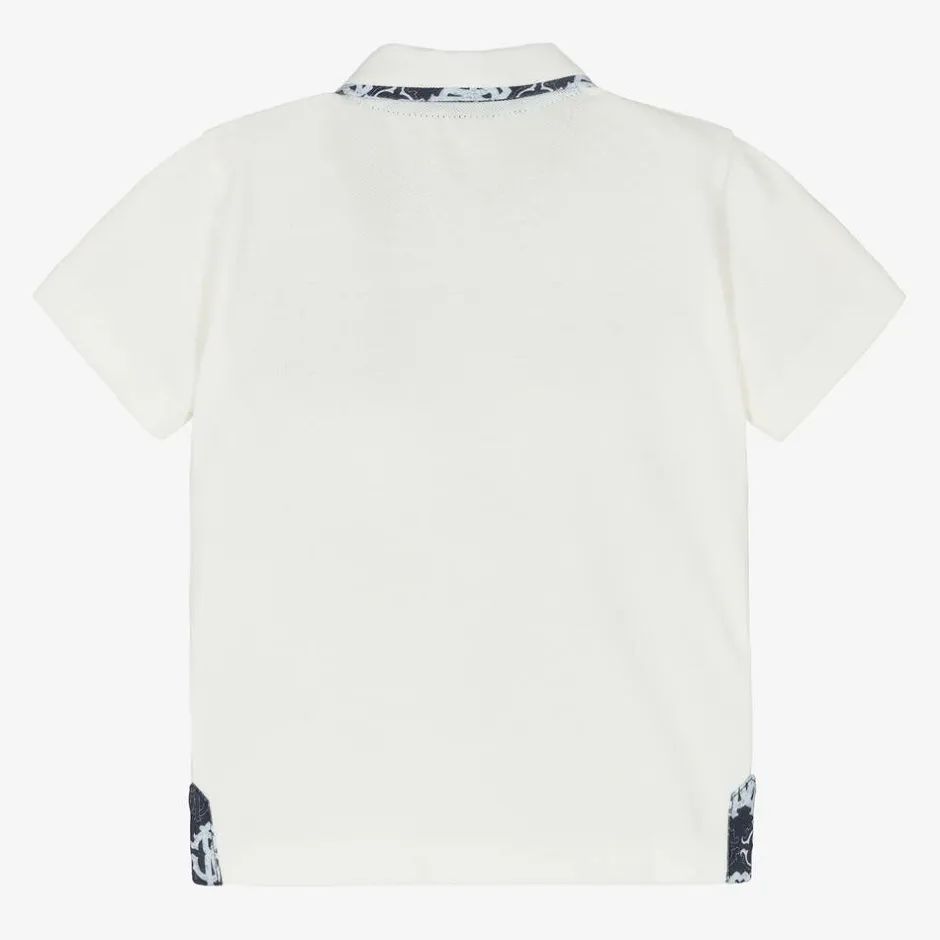White polo shirt for little boys by luxury Italian brand Roberto Cavalli, made in soft cotton piqué. It has blue logo-patterned trims and fastens with branded buttons on the collar and at the front. For a distinctive look, there is a RC monogram patch in grey and blue just below the faux chest pocket.