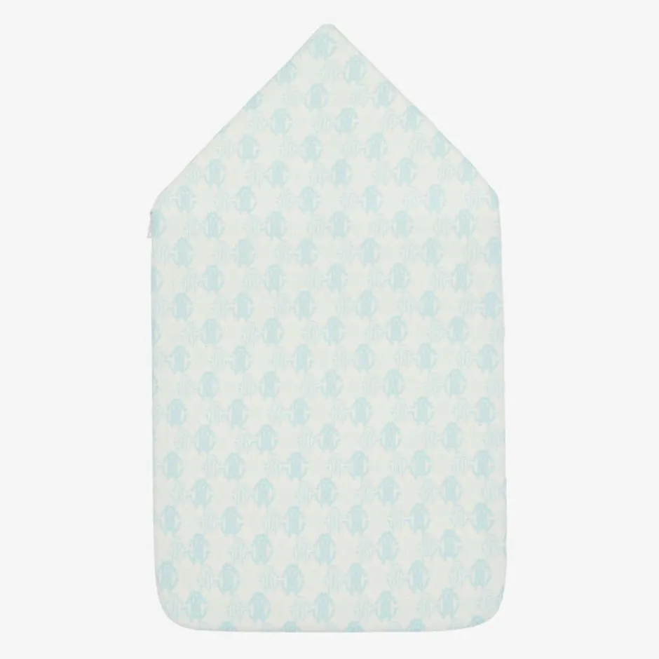 In ivory and pale blue, this lovely nest for baby boys is by luxury brand Roberto Cavalli. Made in the softest cotton jersey, it is patterned with the Italian designer's signature RC Monogram, with pink logo embroidery on the front and shiny gold branded poppers on the hood. Lightly padded for warmth, it secures with a zip along one side and across the base, which can be unfastened to provide a comfortable surface for baby to play on.