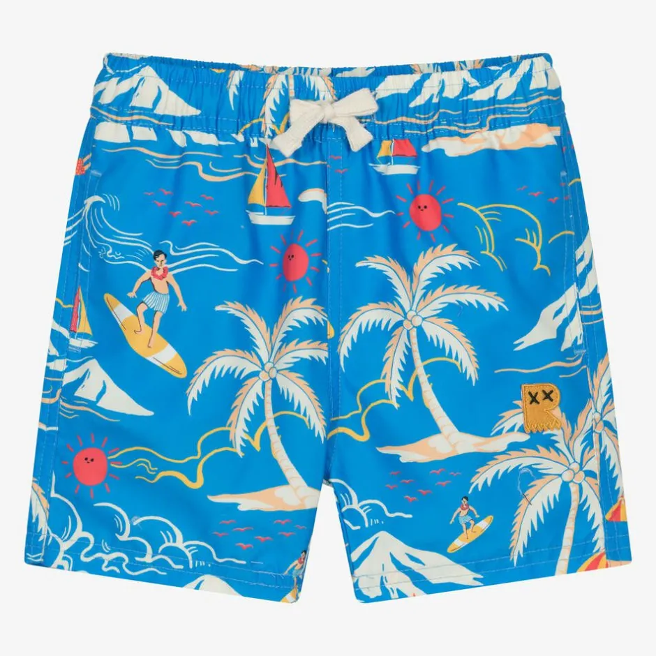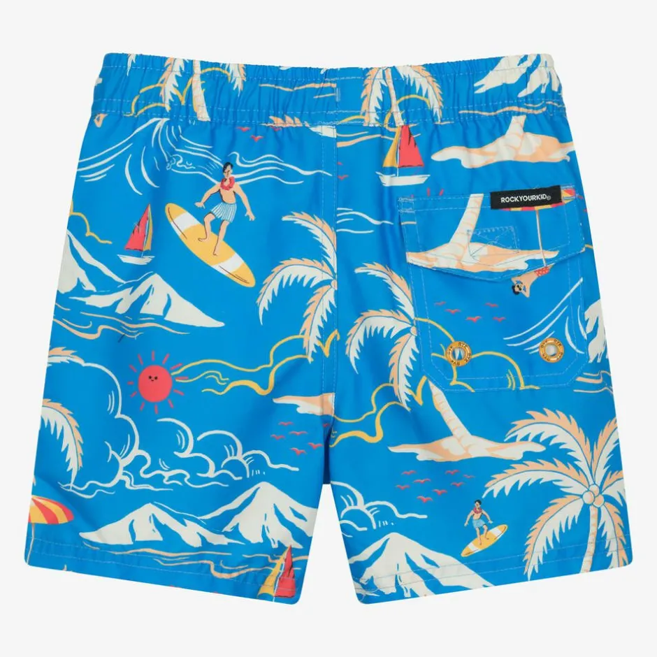 From Australian brand Rock Your Baby, bright blue swim shorts for boys patterned with a tropical surfing scene. With a comfortable mesh lining, these silky smooth shorts have an elasticated waist that can be secured with a drawstring. This item contains recycled fibres.