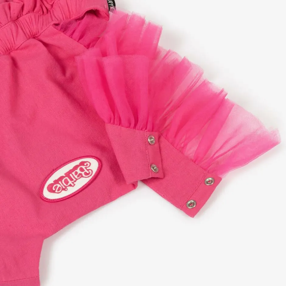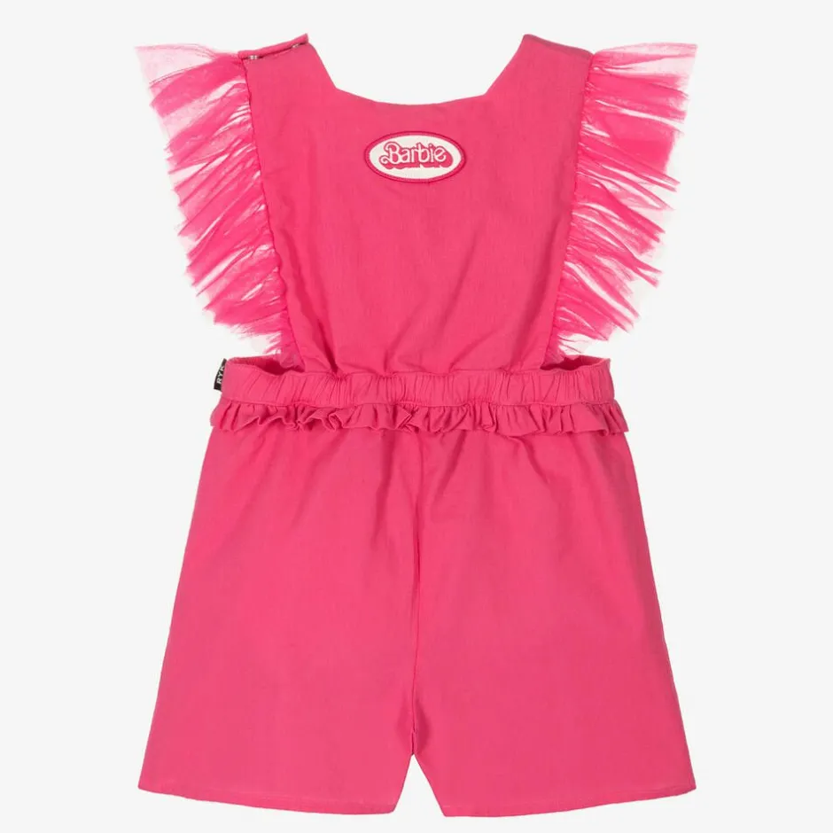 Pretty fuchsia pink playsuit for girls by Rock Your Baby, in collaboration with Barbie. Softly woven in cotton, this one-piece has the instantly recognisable Barbie logo print on the chest and tulle ruffles on the shoulders. The elasticated waist shapes a lovely silhouette, and there are popper fastenings on one shoulder to help with dressing.