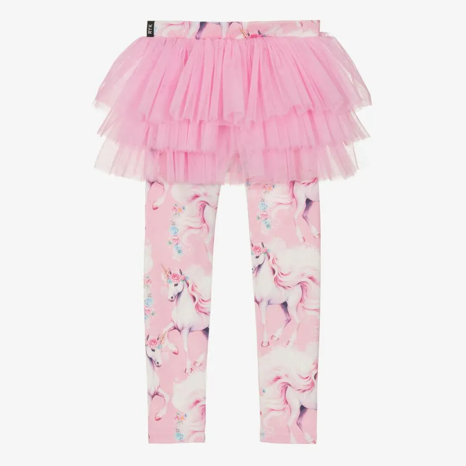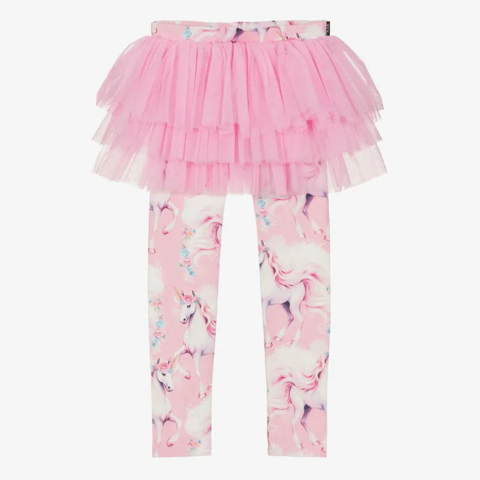 Pink leggings for girls by Rock Your Baby, made in soft cotton jersey. These fun, casual leggings have a lovely unicorn pattern and an attached skirt made from layers of soft tulle. Full length, they have an elasticated waist for a comfortable fit.