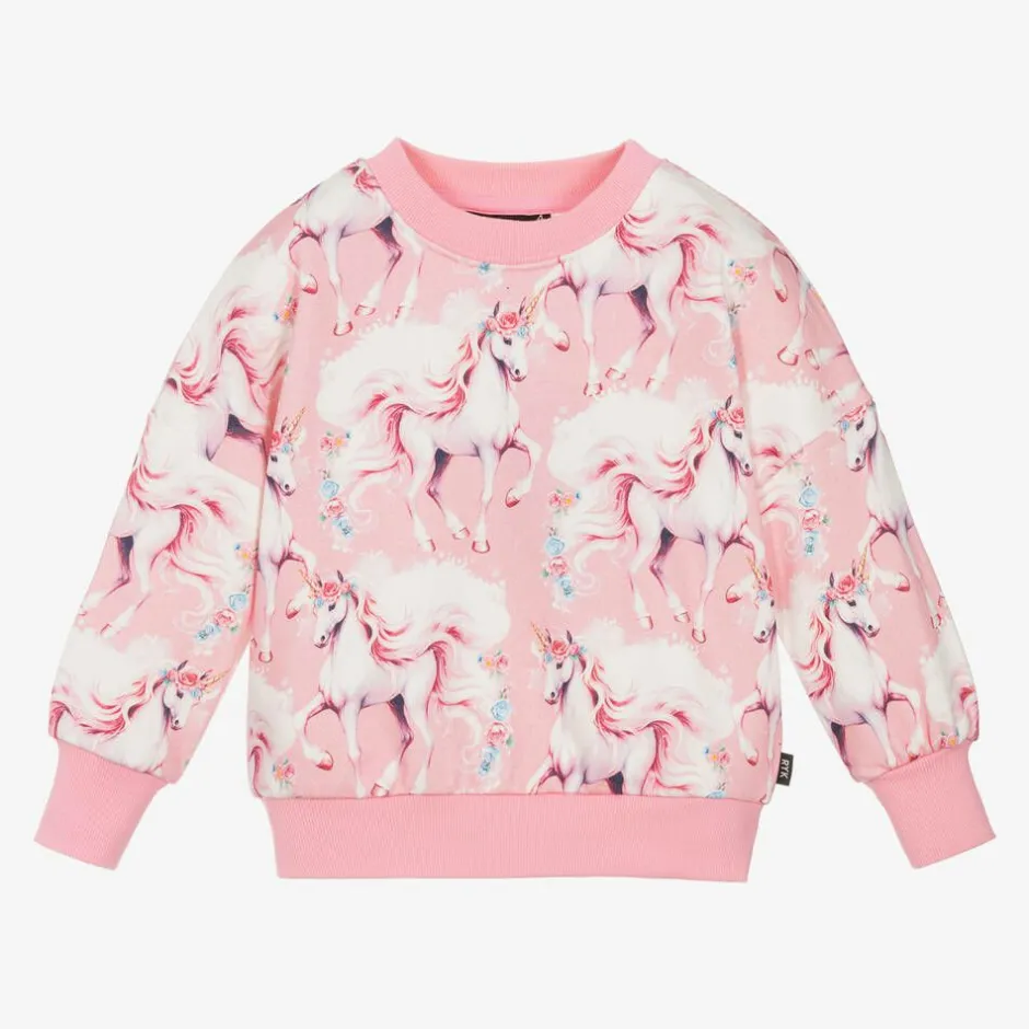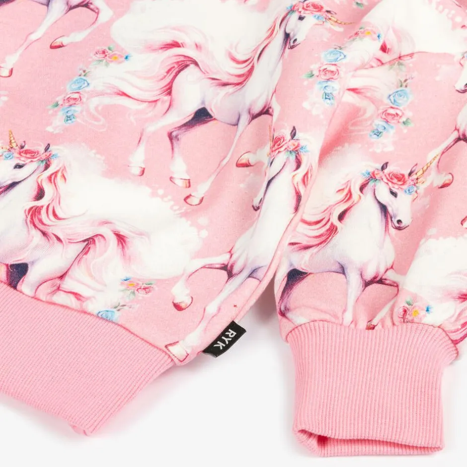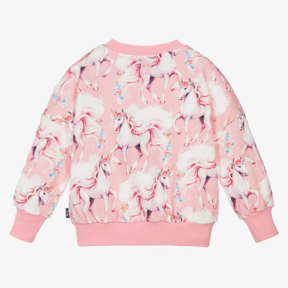 Pink sweatshirt for girls by Rock Your Baby, made in soft, mid-weight cotton jersey. Cool and casual, with dropped shoulders and cosy ribbed trims, it has a lovely unicorn pattern and a black and white logo tab on one side seam for a discreet branded finish.