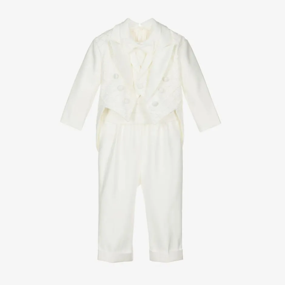 A smart ivory satin tuxedo suit for baby boys by Romano. The suit comprises a jacket, waistcoat and trousers, a shirt with a fixed bow tie, and a cummerbund. The jacket and waistcoat have embroidered trellis patterns. The shirt fastens with buttons on the back, and has an attached bow tie. The smart cummerbund keeps everything in place and has a velcro fastening at the back. The trousers have a comfortable elasticated waist.